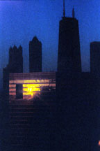 The Jay Pritzker Pavilion, designed by Frank Gehry, is the new home for Chicago's Grant Park Symphony, which for nearly seventy years has been providing free summer concerts in downtown Chicago. The name of the bandshell refers to Chicago's Pritzker family, owners of Hyatt Hotels and the Marmon Group. Cindy Pritzker was instrumental in insisting that Gehry be brought to Chicago to design the new bandshell, the architect's first building in the city. The bandshell, built atop a sublevel muncipal parking garage, is the centerpiece of the city's new $475,000,000 Millennium Park, which was itself constructed partially on the site of an older park that had fallen into massive disrepair, and partially over tracks that were originally built by the Illinois Central Railroad in the early 19th century and that had remained, until Millennium Park's creation, an open trench that separated Michigan Avenue from the city's lakefront. The bandshell has seating for 4,000, with room for another 7,000 people on the broad lawn behind the fixed seating. The site of the old bandshell, which remains the location for the city's fourth of July concert and numerous pop music festivals, was in most places little more than clumps of grass isolated in great expenses of dirt - a heavy rain and it was Woodstock redux. At least for now, the great lawn of the Pritzker pavilion is a thick uninterrupted carpet of newly laid sod.