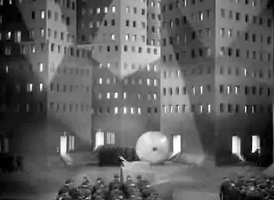 There is no sprawl visible in the city of Metropolis. Just as the modern architecture of the 1920's was an abstraction of core principles and forms, the city of Fritz Lang's 1927 masterpiece is also an abstraction - and a compaction - of both society and the urban condition in Germany at the time of the film's creation. Functions are piled up and pitched down, from the densely packed skyscrapers above, to the several sub-basements where the industrial underpinnings that keep the paradise going are kept hidden, as are, beneath it, the subterranean city where the untermenschen workers are dumped.