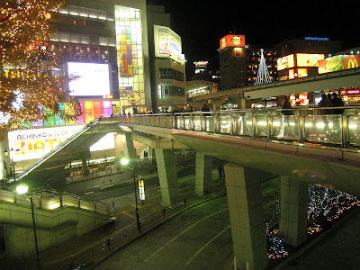 N Building is near the monorail station in the city's Tachikawa district, which is replete with the usual cacophonic blare of Times Square-like signage, seen in this photo from the Pleasure Fruits blog.