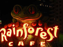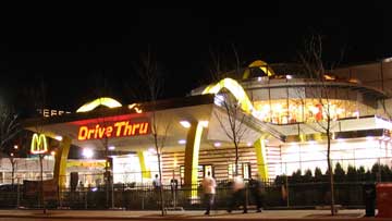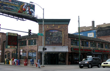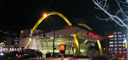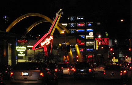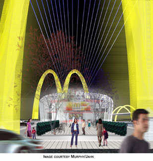 If all goes as planned, the new Rock 'n' Roll McDonald's at Clark and Ontario will open this Friday, 50 years to the day since Ray Kroc opened his first restaurant in Des Plaines. A big blow-out is planned, and the huge temporary tent that's been erected for the celebration may be the only honest piece of architecture on the site. Offered several spectacular designs that would have enriched the revival of modern architecture in Chicago-including an airy steel-and-glass Helmut Jahn pavilion with projection screens for animated Like Alice, fallen down the rabbit hole, devouring a cake marked "Eat Me" and growing and growing faster than Morgan Spurlock, the new McDonald's is less a building than a Claes Oldenburg, a Brobdingnagian blowup of a common object. a mate to his giant Batcolumn from in front of the Harold Washington Social Security Center on Madison at Jefferson. Inside Portillo's, the authentic and the weird combine in a hallucinogenic stew. There's loads of crime memorabilia, from an autographed photo of J. Edgar Hoover to a framed copy of big Al's Florida death certificate. There's a 20's roadster suspended from the ceiling, and the massive 1925 clock from the old Stewart-Warner factory, rescued when the North Side building was demolished in in the 1990's. There's also a large clapboard, depression-era facade above an open kitchen, complete with a barber shop where a slightly creepy mannikin cuts the hair of his mannikin customer. A clothesline with lingerie stretches At first glance, the new McDonald's almost seems too good for this kind of company. It includes a mayor-friendly green roof and enhanced landscaping, Wi-Fi access, and a nod to Chicago architectural Otherwise, it's pretty dull stuff. In the back of the complex, along Ohio Street, a drive-through area, As with vampires, the new McDonald's and the area's the attractions don't respond terribly well to daylight - it seems to bring out and magnify their tackiness to a dispiriting degree. Nighttime is a different story. A few evenings ago, a couple were walking down a far darker stretch of Clark Street a few blocks down, when the man caught sight of the giant neon guitar in the distance. "I'm stangely attracted to the light," he said as he tried persaude his significant other to join him in checking it out, and seconds later both were happily making their moth-like journey towards the Hard Rock and its bright, shiny environs. West Ontario Street, on which most of the attractions are centered, is the anti-Mag Mile, probably as close to the old Las Vegas Strip as you're going to get in downtown Chicago. It's architecture as junk food - pretty surely not good for you, but as tasty as french fries, and just as additive.. It's got the The expected critical response to all this is schoolmarmish "Tsk, Tsk, Tsk!", to which the district's attractions reply, "We're here, we're weird - get used to it.!" Truth be told, in a city as big as Chicago, there's room for both the sublime and the ridiculous. If you can't be good, you should at least aspire to be entertainingly vulgar. A building should always consider the way a it interacts with the surrounding streetscape, and the new McDonald's lucks out in its location. On Michigan Avenue, it would be an atrocity. Placed across the We might want to take a cue from the way that, in the bad old days, cities used to establish red-light districts in which to sequester those shady but essential businesses catering to our most base and persistent instincts. Designate Ontario Street as an official Schlock Corridor, a protected taste-free district, no tax breaks required. Who knows what new wonders it might produce? I've actually thought of four, but since there's been some dispute as to whether they're funny or lame, I've exiled them to a separate page of Schlock Corridor photographs. for which I'm solicitating your suggestions, dear readers, for your own high-concept ideas, in text or graphics, for new Schlock Corridor attractions. E-mail them to me and, unless they look like something I'll be sued for, they'll be posted promptly. Any living city is a composite of high and low, - order and disorder in a constant battle for primacy. Chicago's Schlock corridor is loud, rude, and brimming with life in the vulgate. It doesn't veil or sugarcoat our frenzied consumerism, but offers it up raw. Celebrate it-and contain it. © Copyright 2005-2006 Lynn Becker All rights reserved.