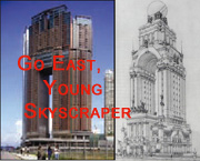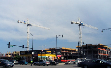 Turrell, who was on hand for Friday's ceremonies, is quoted as saying the UIC Skyspace "deals with light itself, not as "I want to create something that directly connects you to a thought that is wordless, a thought that doesn't have a story line," Turrell is quoted as saying.. "It's an arena of thought that has a kind of loneliness, but also a great beauty." How well this concept works out in practice at the heavily trafficked intersection of Halsted and Roosevelt remains to be seen. Although Turrell has a number of similar installations throughout the world, the one at UIC is described as the first directly accessible from public streets. Turrell's design include trees, a fountain, and, in warmer weather, "curtains of water . . . to soften the sight and sound of traffic and pedestrian activity" The UIC Skyspace is at the crossroads of a boom town of new development, dominated by the massive Ivy Hall residential project just across the street, where no fewer than 700 upscale units are rising on land cleared by the University as part of its massive redevelopment of what was previously Chicago's storied Maxwell Street district, for over a century a rough and tumble retailing district of discount shops and open air markets that catered to Chicago's poor immigrants, from Jews escaping Czarist Russia to blacks escaping the American south.