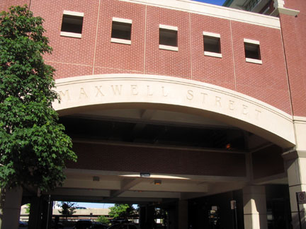 The restored block is terminated at the end by a new parking garage, the street passing under a concrete arch inscribed with the name Maxwell Street. It's a gateway to nowhere. Tucked away on the other side are two polish sausage stands - the last survivors of the street as it was - and the edge-of-the earth frontier of the elevated Dan Ryan Expressway.